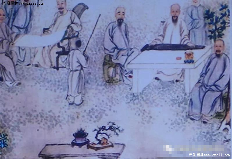 6.王維為什么要在盆中放一塊對(duì)蘭蕙的生長(zhǎng)盛衰沒有任何關(guān)系的石頭呢?更值得人們深思的是馮摯在記述文字中沒有使用“置”、“放”、“擺”、“擱”等常用字,而選用了一個(gè)讓人頗感意外的“養(yǎng)”字。有人不禁要問:本無生命特征的石頭怎么能“養(yǎng)”呢?唯一的答案只能是,身為唐代大詩(shī)人、大畫家、大音樂家的王維,在將自己的繪畫經(jīng)驗(yàn)和“詩(shī)言志”、“詩(shī)緣情而發(fā)”的詩(shī)歌創(chuàng)作理念以及音樂的節(jié)奏、節(jié)拍、旋律、和聲、曲式等藝術(shù)特性和理論等借鑒于盆景創(chuàng)作以后,作為盆景的基本表現(xiàn)元素、本無生命的石頭,就產(chǎn)生了一種奇妙的蛻變。于是,在王維眼中,這塊本無生命的綺石,驟然間華麗轉(zhuǎn)身為一塊擬人化的有生命的“活石”了。而把這樣一塊“活石”“養(yǎng)”起來,也就變得合情合理了。這塊綺石不僅對(duì)盆景營(yíng)構(gòu)畫面起到了烘托、渲染的作用,更重要的是它滿足了創(chuàng)作者對(duì)心理情感、意志品質(zhì)、社會(huì)人生乃至宇宙精神的訴求。可以毫不夸張地說,王維的盆景“養(yǎng)以綺石”,是中國(guó)盆景史上一項(xiàng)前無古人、無與倫比的偉大創(chuàng)舉。中國(guó)盆景從此有了各種配件的廣泛應(yīng)用,有了藝術(shù)意境的創(chuàng)作追求,有了詩(shī)情畫意的審美境界。更為重要的是王維的這一創(chuàng)舉,對(duì)確立中國(guó)盆景的藝術(shù)地位,起到了至關(guān)重要的催化、支撐和穩(wěn)固的作用。王維的“養(yǎng)以綺石”還歷史性地開創(chuàng)和規(guī)范了中國(guó)盆景的基本表現(xiàn)模式,即石與植物的組合。王維的這種盆景模式,受到后世文人特別是文化精英們的熱切關(guān)注和大力推崇。如施耐庵就曾在其名著《水滸傳》(第81回)中專門寫過宋代的松石盆景:浪子燕青拜訪京師名妓李師師,“入到客位前,見周回吊掛名賢書畫。階檐下放著三二十盆怪石蒼松?!倍嫾依钍啃械摹顿人蓤D》以及清葉芳林、方士庻的《九日行庵文燕圖》(圖4)等,畫的都是樹與石結(jié)合的盆景。再看看當(dāng)代中國(guó)盆景,其表現(xiàn)形式豐富多彩,而樹與石組合的盆景更是琳瑯滿目。不管是以樹為主兼以體量很小的單體點(diǎn)綴石組成的盆景,還是以石頭為主兼以樹木為輔的山水盆景、樹附石(圖5)盆景,抑或是石、樹所占比例相差不大甚至幾乎均分的水旱盆景、樹石盆景(圖6)等等,無不是王維盆景制作理念、方法、模式的延續(xù)和拓展。已故著名中國(guó)盆景藝術(shù)大師賀淦蓀先生提出的“樹石盆景”概念及其高足、中國(guó)盆景藝術(shù)大師張志剛君所著《中國(guó)樹石盆景》一書的文化源頭和理論根據(jù),就在這里。